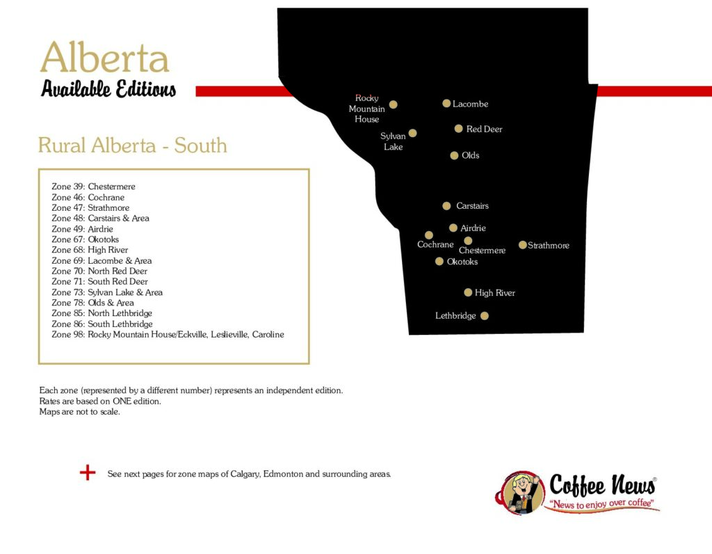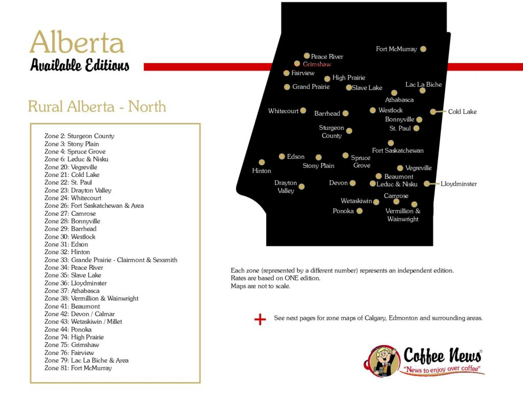Looking for your favourite place to find the Coffee News? Please see the map below of which Edition is published in more than 300 locations across Central Alberta.